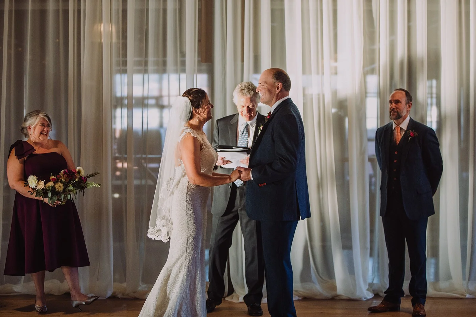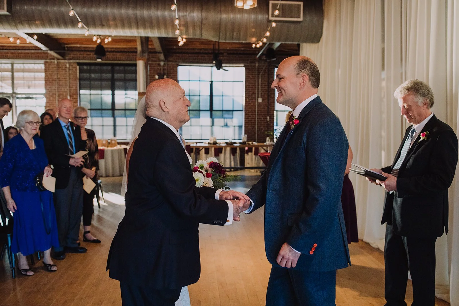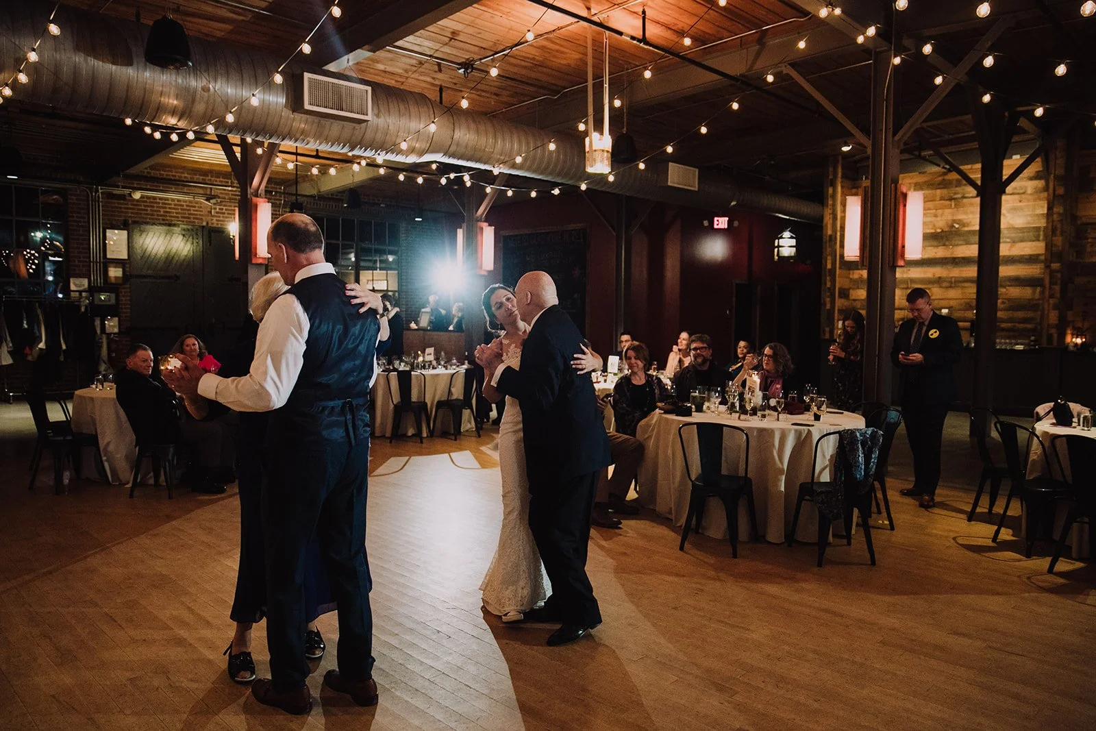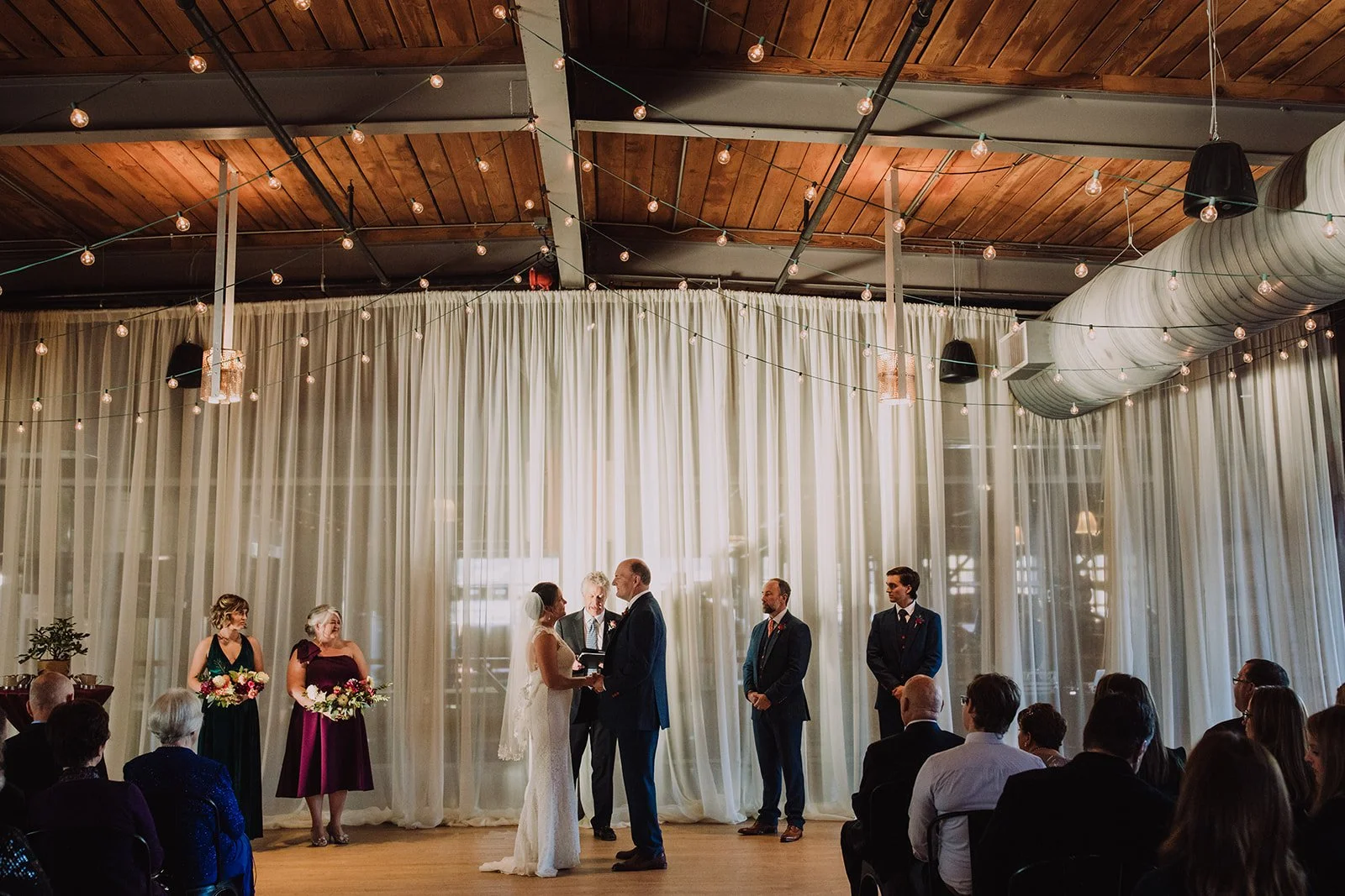This gorgeous autumn day was the perfect day for this celebration of love. If we took anything away from this magical ceremony and reception, it's that this marriage is more than just the "I Do's." It's dancing in the kitchen, millions of small yet cherished moments, the merging of families, and a life full of building on the love that surrounds you. These two tied the knot in a sweet ceremony before transforming the grand room into the ultimate wedding reception, complete with a photo booth, a s'mores station on the balcony, and some good old fashioned competition with corn hole. After lots of fun and dancing, everyone continued the celebration a few doors down at the local barcade, revisiting arcade nostalgia of their youth. Congrats to these two newlyweds in love!
